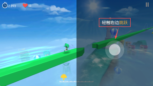 2、跳跃操作:轻触屏幕右侧进行跳跃,避开障碍。