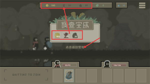 4、完成探索后触发【调查完成】,将获得【180金】等奖励,点击【返回营地】按钮回到初始区域准备后续行动。