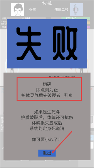 4、若【切磋】失败,牢记【护体灵气先破者-判负】规则,点击【退出】后提升护体属性,再尝试挑战。