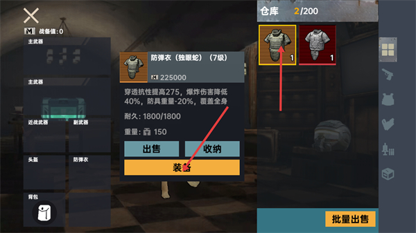1、在仓库界面选中【防弹衣-(独眼蛇)-(7级)】,其有穿透抗性提高275等属性,点击【装备】按钮即可穿戴该防具。