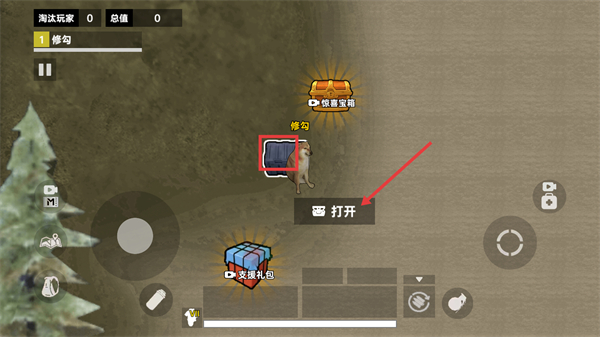 2、在对战场景中找到【惊喜宝箱】,点击下方【打开】按钮获取物资,同时可留意附近的【支援礼包】。