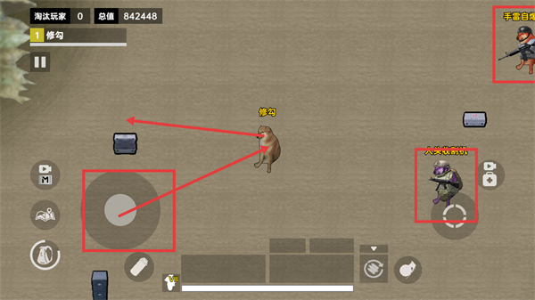 3、对战过程中需留意敌方单位如【手雷自爆】-【人头收割机】,通过左侧控制区域调整自身位置进行应对。