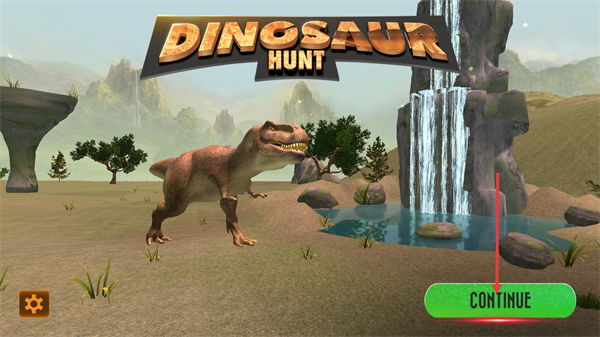 1、进入【DINOSAUR-HUNT】的恐龙场景后,确认当前狩猎环境,点击界面中的【CONTINUE】按钮,即可进入对应的恐龙捕猎关卡。