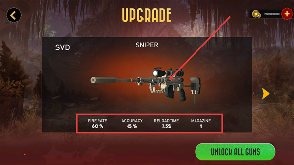 2、在【UPGRADE】界面中,可升级【SVD】-【SNIPER】的【FIRERATE】等属性,也能点击【UNLOCK-ALL-GUNS】解锁更多枪械。