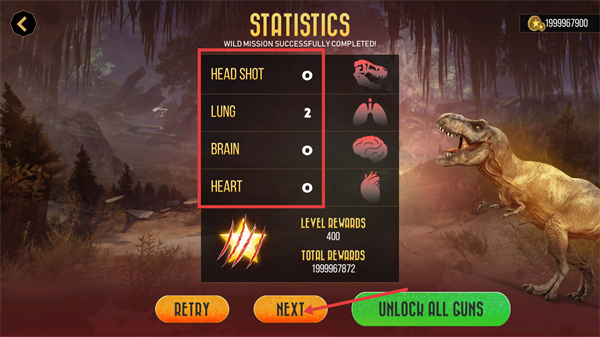4、完成关卡后,查看【STATISTICS】里的【LUNG】命中数,领取【LEVEL-REWARDS】400,选择【NEXT】推进或【RETRY】。