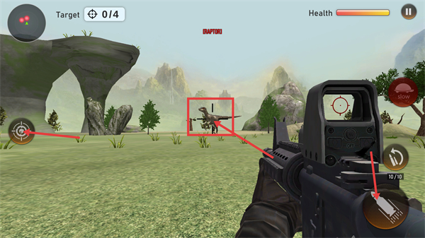 2、进入关卡后,关注【Target-0/4】的目标数,瞄准【RAPTORI】,利用【10/10】弹药按射击键攻击,同时留意【Health】状态。
