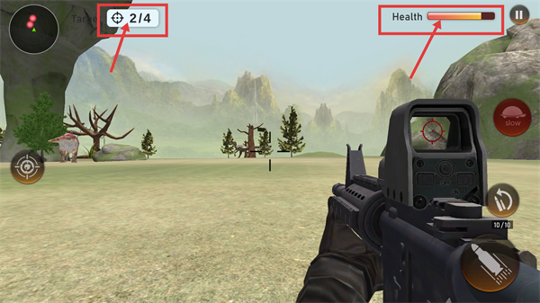 3、推进关卡时,查看【Target-2/4】的进度,关注【Health】条状态,可借助【slow】功能辅助瞄准剩余目标。