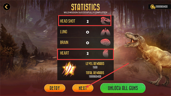 4、完成任务后,查看【STATISTICS】里的【HEAD-SHOT-2】等数据,领取【LEVEL-REWARDS-1500】,点击【NEXT】推进下一关。