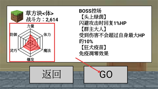 1、查看【草方块<体>】的【头上绿茵】【群主大人】【狂犬疫苗】技能效果,确认其战斗力-2,614后,点击【GO】进入对战。