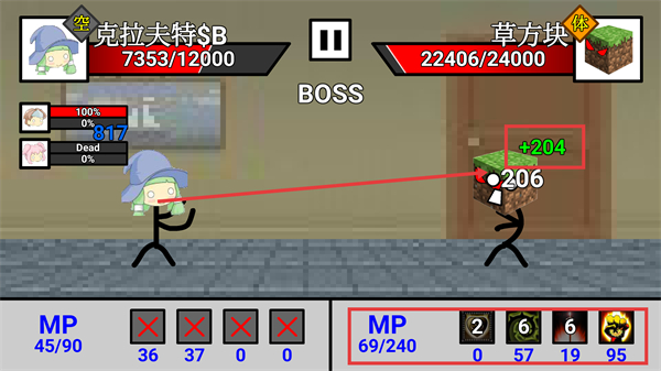 3、对战中期注意【草方块<体>】闪避后的【+204】回复效果,同时关注我方单位存活状态与双方MP数值变化。