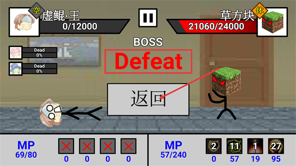 4、若出现【Defeat】提示代表对战失败,此时点击【返回】按钮退出对战界面,后续可调整阵容再挑战。