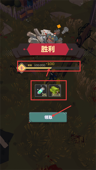 4、当“剩余数量”清零后会触发胜利结算,界面将展示获得的经验与道具奖励,点击“领取”按钮即可获取奖励,完成当前关卡流程。