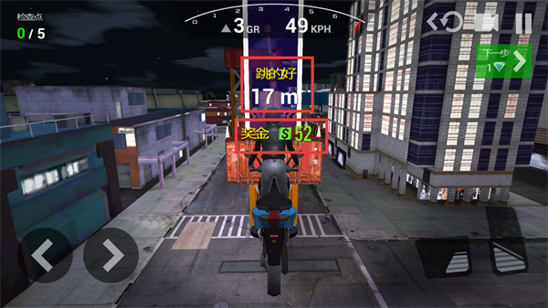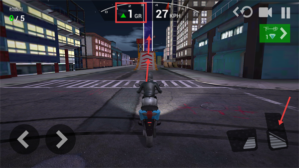 2、关注【检查点-0/5】的进度,通过右侧踏板键提升速度,冲向坡道完成跳跃,推进挑战的进程。