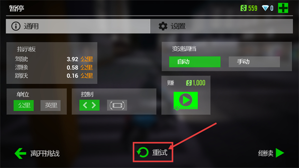 4、挑战未完成时点击【重试】重新参与,借助【自动变速档】功能提升驾驶效率,争取完成挑战。