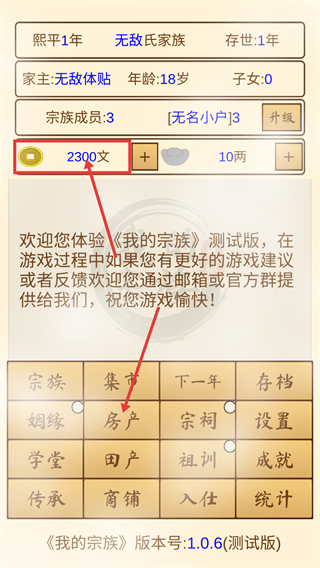 1、开局后可查看当前【2300文】的资源,点击界面中的【房产】选项,进入相关界面来购置房产,为宗族积累资产。