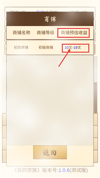 4、进入【商铺】界面,可查看【初级商铺】对应的【商铺预估收益-10-19文】,布局商铺提升宗族的持续收益。