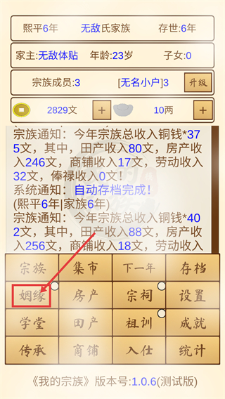 1、界面中可点击【姻缘】选项,当前宗族持有【2829文】资源,开启配偶选择流程以扩充宗族成员。