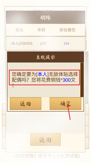 2、系统提示为【无敌体贴】选配偶需花费【铜钱*300文】,确认资源充足后点击【确定】执行操作。
