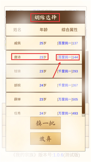 3、在【姻缘选择】界面,可查看【唐诗-23岁】对应的【综合属性-144】,选择适配的配偶助力宗族发展。