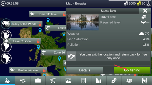 1、在地图选择【Sawai-lake】,查看其【7℃】天气、【40%】鱼饱和度等参数,点击【Go-fishing】进入该地点垂钓。