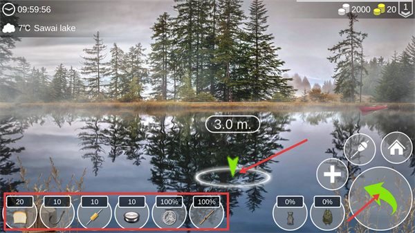 2、进入垂钓界面,准备好【面包】【鱼钩】等道具,在【3.0-m】区域对应位置下钩,开启钓鱼流程。