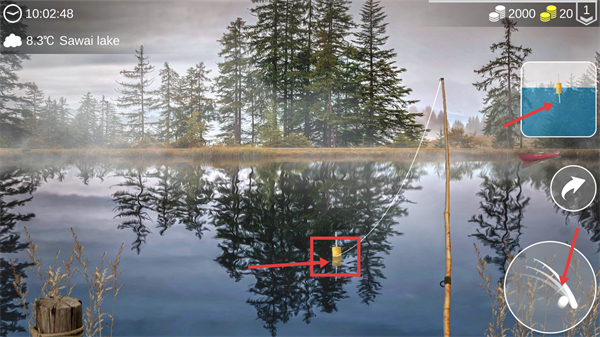 3、垂钓过程中关注【浮漂】动态,当浮漂出现异动时,操作鱼竿完成咬钩环节的互动操作。