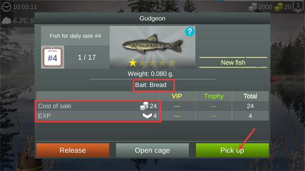 4、成功钓到【Gudgeon】,该鱼用【Bread】作饵,可获【24】货币与【4】经验,点击【Pick-up】收取收获。