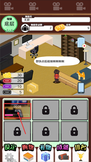2、频道名【无敌】-级别【底层】,查看当前视频进度【00:06-40%】,等待拍摄进程完成以获取内容。
