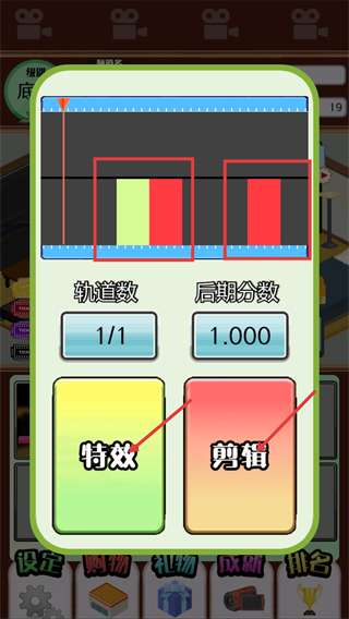 3、进入后期界面,【轨道数-1/1】【后期分数-1.000】,可点击【特效】【剪辑】按钮优化视频内容。