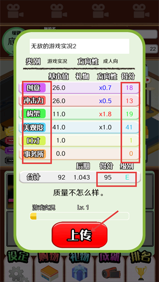 4、作品【无敌的游戏实况2】-类别【游戏实况】,合计得分【95-级别-E】,确认质量后点击【上传】发布内容。