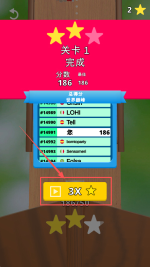 4、完成结算:在关卡1完成界面查看186分,点击3X领取奖励。