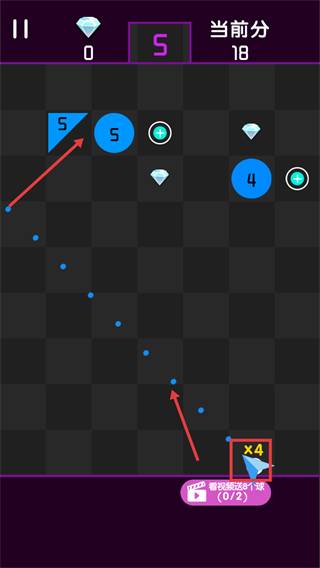 2、游玩过程中,瞄准【5】【4】等数字方块弹射弹珠,提升【当前分-18】,还能通过【看视频送1球】补充弹珠数量。