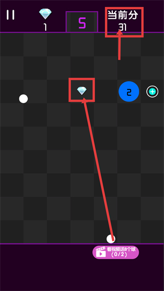 3、弹射弹珠时优先命中界面中的【钻石】获取道具,瞄准【2】方块累积分数,助力提升【当前分-31】。
