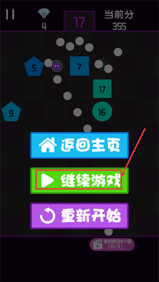 4、游戏暂停后,可选择【继续游戏】延续当前进度,或点【重新开始】重置对局,积累分数提升【当前分-355】。
