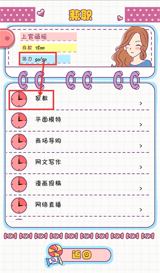 1、角色为【上官涵瑶】,当前【存款-1800】【体力-50/50】,在兼职界面可选择【家教】选项,这是获取存款的有效兼职途径。