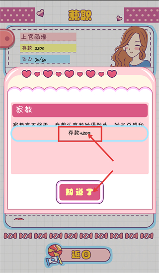 2、完成【家教】兼职后,存款增加至【存款-2200】,【体力-30/50】,点击【知道了】按钮确认该兼职收益。