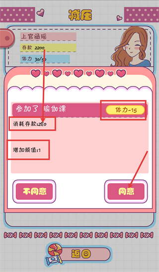 3、在减压界面选择【瑜伽课】,参与需【消耗存款-280】并扣减【体力-15】,同时【增加颜值-1】,点击【同意】参与。