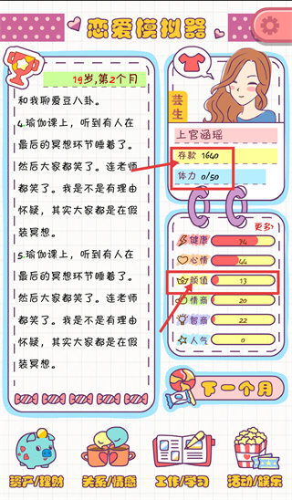 4、进入19岁第2个月,当前【存款-1640】【体力-0/50】【颜值-13】,可通过瑜伽课相关剧情推进游戏进程。