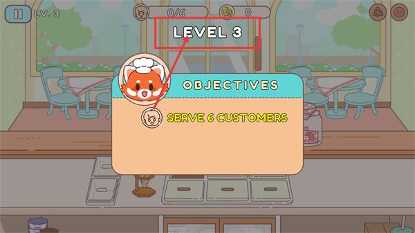 1、当前处于【LEVEL-3】,关卡目标为【SERVE-6-CUSTOMERS】,开局先确认该目标,再着手准备为顾客提供服务,推进关卡进度。