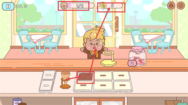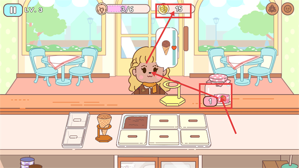3、已完成【3/6】顾客的服务,积累【15】金币,根据顾客显示的【冰淇淋】需求,匹配对应的食材,可提升服务的效率与节奏。