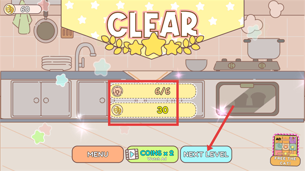 4、成功完成【6/6】顾客的服务,获得【30】金币,关卡达成【CLEAR】状态,可点击界面的【NEXT-LEVEL】进入下一个关卡。
