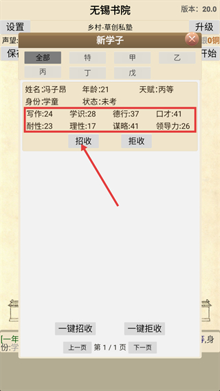 2、在书院新学子界面,查看如【冯子昂】的属性(【写作24】-【学识28】等),依据天赋等级点击【招收】将其纳入书院进行培养。