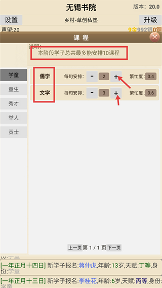 3、进入课程界面后,需留意【本阶段学子总共最多能安排10课程】,可通过加减按钮调整【儒学】【文学】的每旬安排数量。