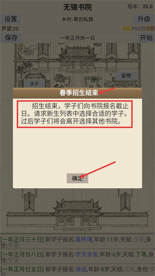 4、出现【春季招生结束】提示时,要及时在新生列表选合适学子,点击【确定】,未选学子会离开选择其他书院。