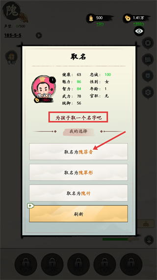 2、在取名界面,为孩子选择【取名为隗菲音】等名称选项,完成孩子的命名操作,推进游戏的流程。