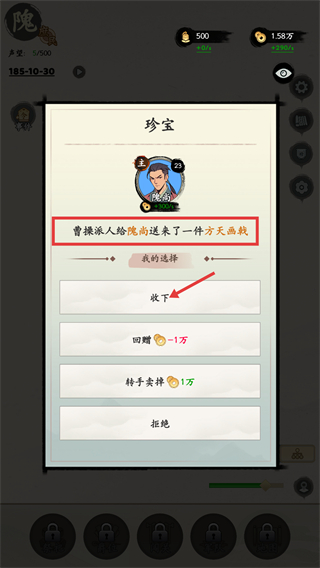 3、遇到曹操送来【方天画戟】的珍宝事件时,选择【收下】选项,获取这件珍稀宝物来提升自身资源。