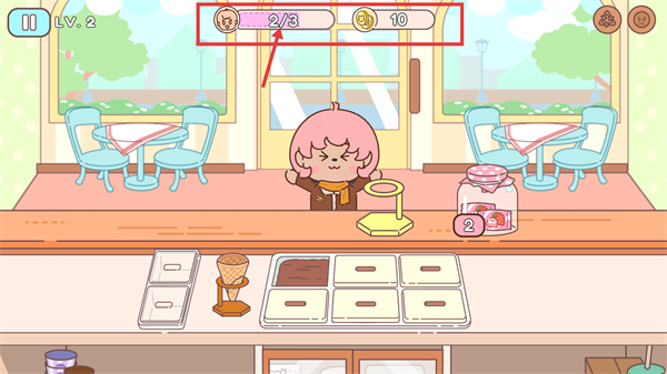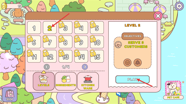 1、在关卡选择界面选中【LEVEL2】,查看目标为【SERVE3-CUSTOMERS】,点击【PLAY】按钮即可进入该关卡开始经营。