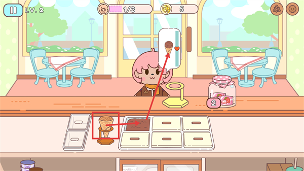 2、进入关卡后,根据顾客需求的【巧克力-冰淇淋】,先选中【冰淇淋蛋筒】,再添加对应【巧克力酱料】来制作餐品交付。