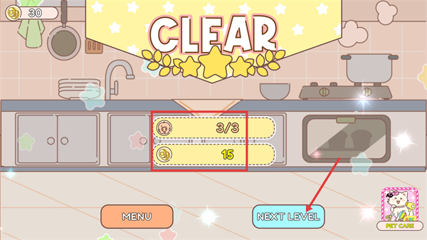 4、完成【3/3-顾客订单】后通关,获得对应金币,点击界面的【NEXT-LEVEL】按钮即可进入下一个关卡。