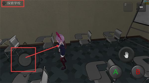1、在【探索学校】的任务场景里,操控左侧移动按钮控制角色移动,靠近指定区域,推进该任务的探索进程。